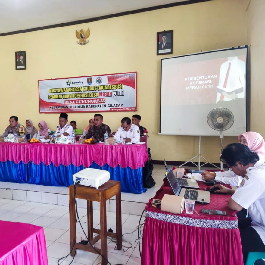 Gunungreja, 16 Mei 2025 — Pemerintah Desa Gunungreja, Kecamatan Sidareja, Kabupaten Cilacap menggelar Musyawarah Desa Khusus (Musdeskhus) pada Jumat, 16 Mei 2025, dengan agenda utama pembentukan Koperasi Desa Merah Putih. Kegiatan ini dilaksanakan di Balai Desa Gunungreja dan dihadiri oleh perangkat desa, BPD, tokoh agama, tokoh masyarakat, tokoh pemuda, kelompok tani, pelaku UMKM, serta perwakilan warga dari setiap dusun.